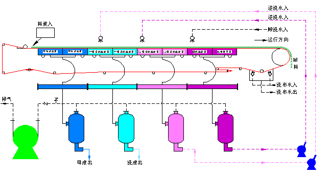 以濾布為過濾介質(zhì),充分利用物料重力和真空吸力實現(xiàn)固液分離的高效過濾設(shè)備。采用整體模塊過濾盤作為真空室,濾布由傳動裝置拖動連續(xù)運行。過濾行程開始時,濾盤在真空狀態(tài)下與濾布同步運行;非真空狀態(tài)下,濾盤與濾布作反向運行。物料通過料漿分布器連續(xù)均布在濾布上,真空狀態(tài)時過濾,非真空狀態(tài)時排液,濾盤通過氣缸拉回,連續(xù)進行母液抽濾、濾渣洗滌、抽干過濾,濾餅在卸料輥處被刮刀卸除,濾液在濾盤返回時排出。濾布經(jīng)清洗和糾偏后,重新回到布料區(qū)。